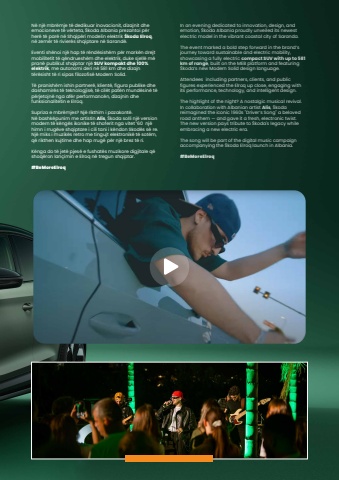 N%u00eb nj%u00eb mbr%u00ebmje t%u00eb dedikuar inovacionit, dizajnit dhe emocioneve t%u00eb v%u00ebrteta, %u0160koda Albania prezantoi p%u00ebr her%u00eb t%u00eb par%u00eb n%u00eb Shqip%u00ebri modelin elektrik %u0160koda Elroq, n%u00eb zem%u00ebr t%u00eb rivier%u00ebs shqiptare n%u00eb Sarand%u00eb.Eventi sh%u00ebnoi nj%u00eb hap t%u00eb r%u00ebnd%u00ebsish%u00ebm p%u00ebr mark%u00ebn drejt mobilitetit t%u00eb q%u00ebndruesh%u00ebm dhe elektrik, duke sjell%u00eb m%u00eb pran%u00eb publikut shqiptar nj%u00eb SUV kompakt dhe 100% elektrik, me autonomi deri n%u00eb 581 km dhe dizajn t%u00ebr%u00ebsisht t%u00eb ri sipas filozofis%u00eb Modern Solid.T%u00eb pranish%u00ebm ishin partner%u00eb, klient%u00eb, figura publike dhe dashamir%u00ebs t%u00eb teknologjis%u00eb, t%u00eb cil%u00ebt pat%u00ebn mund%u00ebsin%u00eb t%u00eb p%u00ebrjetojn%u00eb nga af%u00ebr performanc%u00ebn, dizajnin dhe funksionalitetin e Elroq.Supriza e mbr%u00ebmjes? Nj%u00eb rikthim i pazakont%u00eb.N%u00eb bashk%u00ebpunim me artistin Alis, %u0160koda solli nj%u00eb version modern t%u00eb k%u00ebng%u00ebs ikonike t%u00eb shoferit nga vitet %u201960 nj%u00eb himn i rrug%u00ebve shqiptare i cili tani i k%u00ebndon Skod%u00ebs s%u00eb re.Nj%u00eb miks i muzik%u00ebs retro me tingujt elektronik%u00eb t%u00eb sot%u00ebm, q%u00eb rikthen kujtime dhe hap rrug%u00eb p%u00ebr nj%u00eb brez t%u00eb ri.K%u00ebnga do t%u00eb jet%u00eb pjes%u00eb e fushat%u00ebs muzikore digjitale q%u00eb shoq%u00ebron lan%u00e7imin e Elroq n%u00eb tregun shqiptar.#BeMoreElroqIn an evening dedicated to innovation, design, and emotion, %u0160koda Albania proudly unveiled its newest electric model in the vibrant coastal city of Saranda.The event marked a bold step forward in the brand%u2019s journey toward sustainable and electric mobility, showcasing a fully electric compact SUV with up to 581 km of range, built on the MEB platform and featuring %u0160koda%u2019s new Modern Solid design language.Attendees including partners, clients, and public figures experienced the Elroq up close, engaging with its performance, technology, and intelligent design.The highlight of the night? A nostalgic musical revival.In collaboration with Albanian artist Alis, %u0160koda reimagined the iconic 1960s \road anthem %u2014 and gave it a fresh, electronic twist.The new version pays tribute to %u0160koda's legacy while embracing a new electric era.The song will be part of the digital music campaign accompanying the %u0160koda Elroq launch in Albania.#BeMoreElroqVIDEO