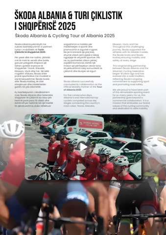 %u0160koda Albania & Turi %u00c7iklistiki Shqip%u00ebris%u00eb 2025%u0160koda Albania & Cycling Tour of Albania 2025%u0160koda Albania p%u00ebrmbylli me sukses bashk%u00ebpunimin si partneri zyrtar i mobilitetit n%u00eb Turin %u00c7iklistik t%u00eb Shqip%u00ebris%u00eb 2025.P%u00ebr pes%u00eb dit%u00eb me radh%u00eb, %u00e7iklist%u00ebt m%u00eb t%u00eb mir%u00eb t%u00eb vendit dhe bot%u00ebs garuan p%u00ebrgjat%u00eb etapave q%u00eb lidh%u00ebn qytetet kryesore t%u00eb Shqip%u00ebris%u00eb: Tiran%u00eb, Shkod%u00ebr, Elbasan, Vlor%u00eb dhe Fier. N%u00eb k%u00ebt%u00eb rrug%u00ebtim sfidues, %u0160koda ishte pran%u00eb sportist%u00ebve me modelet e saj t%u00eb besueshme: %u0160koda Scala dhe %u0160koda Kodiaq, t%u00eb cilat shoq%u00ebruan dhe mb%u00ebshtet%u00ebn gar%u00ebn n%u00eb %u00e7do kilomet%u00ebr.Ky bashk%u00ebpunim i r%u00ebnd%u00ebsish%u00ebm mes %u0160koda Albania dhe Federat%u00ebs Shqiptare t%u00eb %u00c7iklizmit ka nisur p%u00ebr her%u00eb t%u00eb par%u00eb para 18 vitesh dhe %u00ebsht%u00eb kthyer tashm%u00eb n%u00eb nj%u00eb tradit%u00eb t%u00eb q%u00ebndrueshme, duke reflektuar angazhimin e mark%u00ebs p%u00ebr mb%u00ebshtetjen e sportit dhe promovimin e siguris%u00eb rrugore.Ne jemi krenar%u00eb q%u00eb prej kaq shum%u00eb vitesh jemi pjes%u00eb e k%u00ebsaj ngjarjeje t%u00eb ve%u00e7ant%u00eb sportive. P%u00ebr ne, ky partneritet shkon p%u00ebrtej aspektit komercial, %u00ebsht%u00eb nj%u00eb mision q%u00eb p%u00ebrfaq%u00ebson vlerat tona t%u00eb p%u00ebrkushtimit ndaj komunitetit te %u00e7iklizmit dhe l%u00ebvizjes s%u00eb sigurt%u0160koda Albania successfully concluded its collaboration as the Official Mobility Partner of the Tour of Albania 2025.For five consecutive days, Albania%u2019s and international top cyclists competed across key stages connecting the country%u2019s main cities: Tirana, Shkodra, Elbasan, Vlora, and Fier. Throughout this challenging journey, %u0160koda supported the athletes with its reliable models, the %u0160koda Scala and %u0160koda Kodiaq ensuring mobility and safety at every stage.This longstanding partnership between %u0160koda Albania and the Albanian Cycling Federation began 18 years ago and has evolved into a solid tradition, reflecting %u0160koda%u2019s ongoing commitment to supporting sport and promoting road safety.We are proud to have been part of this remarkable sporting event for so many years. For us, this partnership goes beyond a commercial collaboration it is a mission that embodies our brand values of the cycling community and dedication to safe mobility.VIDEO