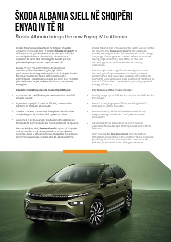 %u0160koda Albania sjell n%u00eb Shqip%u00ebriEnyaq iV t%u00eb ri%u0160koda Albania brings the new Enyaq iV to Albania%u0160koda Albania ka prezantuar n%u00eb tregun shqiptar versionin m%u00eb t%u00eb ri t%u00eb SUV-it elektrik %u0160koda Enyaq iV, t%u00eb ridizenjuar me gjuh%u00ebn e re vizuale Modern Solid. Ky model i p%u00ebrmir%u00ebsuar ofron dizajn t%u00eb avancuar, efikasitet t%u00eb lart%u00eb dhe teknologji t%u00eb fundit p%u00ebr nj%u00eb p%u00ebrvoj%u00eb t%u00eb p%u00ebrparuar n%u00eb drejtimin elektrik.Enyaq iV vjen me p%u00ebrmir%u00ebsime t%u00eb dukshme aerodinamike dhe teknologjike, q%u00eb rrisin performanc%u00ebn dhe gam%u00ebn e p%u00ebrdorimit t%u00eb p%u00ebrditsh%u00ebm. Nj%u00eb nga ve%u00e7orit%u00eb kryesore %u00ebsht%u00eb koeficienti i p%u00ebrmir%u00ebsuar i rezistenc%u00ebs s%u00eb ajrit, q%u00eb arrin deri n%u00eb 0.225 p%u00ebr versionin Coup%u00e9, duke optimizuar konsumin e energjis%u00eb.Karakteristikat kryesore t%u00eb modelit p%u00ebrfshijn%u00eb:Autonomi deri n%u00eb 588 km p%u00ebr versionin SUV dhe 597 km p%u00ebr Coup%u00e9.Ngarkim i shpejt%u00eb DC deri n%u00eb 175 kW, me mund%u00ebsi karikimi 10%u201380% p%u00ebr 28 minuta.Interier modern, me material t%u00eb q%u00ebndruesh%u00ebm dhe dizajn elegant sipas filozofis%u00eb %u201cgreen & clever%u201d.Asistenc%u00eb e avancuar p%u00ebr drejtuesin dhe aplikacion My%u0160koda t%u00eb p%u00ebrmir%u00ebsuar p%u00ebr funksionalitete t%u00eb zgjuara.P%u00ebrmes k%u00ebtij modeli, %u0160koda Albania synon t%u00eb fuqizoj%u00eb m%u00eb tej ofert%u00ebn e saj n%u00eb segmentin e automjeteve elektrike, duke u ofruar klient%u00ebve shqiptar%u00eb nj%u00eb p%u00ebrvoj%u00eb drejtimi t%u00eb avancuar, efikase dhe t%u00eb q%u00ebndrueshme.%u0160koda Albania has introduced the latest version of the all-electric SUV %u0160koda Enyaq iV to the Albanian market, redesigned with the new Modern Solid design language. This upgraded model delivers advanced styling, high efficiency, and state-of-the-art technology for an enhanced electric driving experience.The Enyaq iV offers significant aerodynamic and technological improvements, increasing overall performance and everyday usability. One of the key highlights is its optimized drag coefficient, reaching as low as 0.225 for the Coup%u00e9 version, ensuring optimal energy efficiency.Key features of the model include:Driving range up to 588 km for the SUV and 597 km for the Coup%u00e9.Fast DC charging up to 175 kW, enabling 10%u201380% charging in just 28 minutes.Modern interior, with sustainable materials and elegant design in line with the \philosophy.Advanced driver assistance systems and an upgraded My%u0160koda app offering smart connectivity features.With this model, %u0160koda Albania aims to further strengthen its position in the electric vehicle segment, providing Albanian customers with an advanced, efficient, and sustainable driving experience.