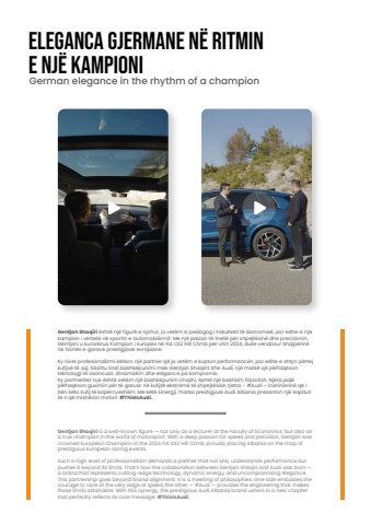 Gentjan Shaqiri %u00ebsht%u00eb nj%u00eb figur%u00eb e njohur, jo vet%u00ebm si pedagog i Fakultetit t%u00eb Ekonomis%u00eb, por edhe si nj%u00eb kampion i v%u00ebrtet%u00eb n%u00eb sportin e automobilizmit. Me nj%u00eb pasion t%u00eb thell%u00eb p%u00ebr shpejt%u00ebsin%u00eb dhe precizionin, Gentjani u kuror%u00ebzua Kampion i Europ%u00ebs n%u00eb FIA CEZ Hill Climb p%u00ebr vitin 2024, duke vendosur Shqip%u00ebrin%u00eb n%u00eb hart%u00ebn e garave prestigjioze evropiane.Ky nivel profesionalizmi k%u00ebrkon nj%u00eb partner q%u00eb jo vet%u00ebm e kupton performanc%u00ebn, por edhe e shtyn p%u00ebrtej kufijve t%u00eb saj. K%u00ebshtu lindi bashk%u00ebpunimi mes Gentjan Shaqirit dhe Audi, nj%u00eb mark%u00eb q%u00eb p%u00ebrfaq%u00ebson teknologji t%u00eb avancuar, dinamiz%u00ebm dhe eleganc%u00eb pa kompromis.Ky partneritet nuk %u00ebsht%u00eb vet%u00ebm nj%u00eb bashk%u00ebpunim imazhi, %u00ebsht%u00eb nj%u00eb bashkim filozofish. Nj%u00ebra pal%u00eb p%u00ebrfaq%u00ebson guximin p%u00ebr t%u00eb garuar n%u00eb kufijt%u00eb ekstrem%u00eb t%u00eb shpejt%u00ebsis%u00eb, tjetra %u2013 #Audi %u2013 inxhinierin%u00eb q%u00eb i b%u00ebn k%u00ebto kufij t%u00eb kap%u00ebrcyesh%u00ebm. Me k%u00ebt%u00eb sinergji, marka prestigjoze Audi Albania prezanton nj%u00eb kapitull t%u00eb ri q%u00eb mish%u00ebron moton: #ThisIsAudi.Gentjan Shaqiri is a well-known figure %u2014 not only as a lecturer at the Faculty of Economics, but also as a true champion in the world of motorsport. With a deep passion for speed and precision, Gentjan was crowned European Champion in the 2024 FIA CEZ Hill Climb, proudly placing Albania on the map of prestigious European racing events.Such a high level of professionalism demands a partner that not only understands performance but pushes it beyond its limits. That%u2019s how the collaboration between Gentjan Shaqiri and Audi was born %u2014 a brand that represents cutting-edge technology, dynamic energy, and uncompromising elegance.This partnership goes beyond brand alignment; it is a meeting of philosophies. One side embodies the courage to race at the very edge of speed, the other %u2014 #Audi %u2014 provides the engineering that makes those limits attainable. With this synergy, the prestigious Audi Albania brand ushers in a new chapter that perfectly reflects its core message: #ThisIsAudi.Eleganca Gjermane n%u00eb Ritmine nj%u00eb KampioniGerman elegance in the rhythm of a champion