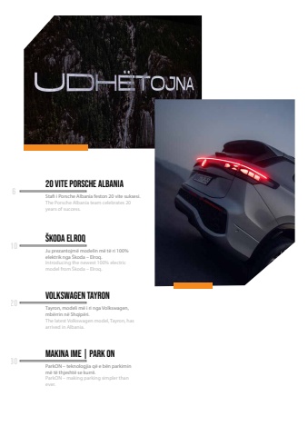 Volkswagen TayronTayron, modeli m%u00eb i ri nga Volkswagen, mb%u00ebrrin n%u00eb Shqip%u00ebri.The latest Volkswagen model, Tayron, has arrived in Albania.Makina ime | Park OnParkON %u2013 teknologjia q%u00eb e b%u00ebn parkimin m%u00eb t%u00eb thjesht%u00eb se kurr%u00eb.ParkON %u2013 making parking simpler than ever.20 vite Porsche AlbaniaStafi i Porsche Albania feston 20 vite suksesi.The Porsche Albania team celebrates 20 years of success.%u0160koda ElroqJu prezantojm%u00eb modelin m%u00eb t%u00eb ri 100% elektrik nga %u0160koda %u2013 Elroq.Introducing the newest 100% electric model from %u0160koda %u2013 Elroq.6102030