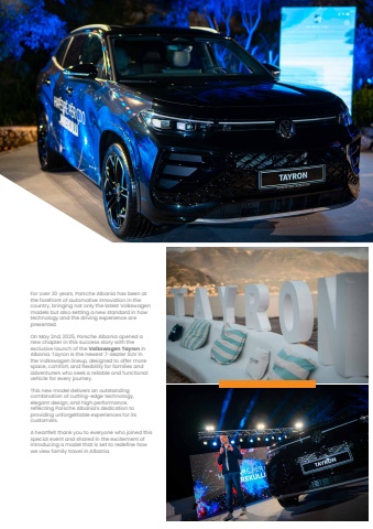 For over 20 years, Porsche Albania has been at the forefront of automotive innovation in the country, bringing not only the latest Volkswagen models but also setting a new standard in how technology and the driving experience are presented.On May 2nd, 2025, Porsche Albania opened a new chapter in this success story with the exclusive launch of the Volkswagen Tayron in Albania. Tayron is the newest 7-seater SUV in the Volkswagen lineup, designed to offer more space, comfort, and flexibility for families and adventurers who seek a reliable and functional vehicle for every journey.This new model delivers an outstanding combination of cutting-edge technology, elegant design, and high performance, reflecting Porsche Albania%u2019s dedication to providing unforgettable experiences for its customers.A heartfelt thank you to everyone who joined this special event and shared in the excitement of introducing a model that is set to redefine how we view family travel in Albania.
