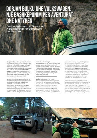 Dorjan Bulku %u00ebsht%u00eb nj%u00eb sip%u00ebrmarr%u00ebs i njohur shqiptar, i njohur jo vet%u00ebm p%u00ebr sukseset e tij n%u00eb biznes, por edhe p%u00ebr angazhimin e tij aktiv n%u00eb fush%u00ebn e mjedisit dhe filantropis%u00eb. Si themelues dhe aktivist i organizat%u00ebs Trees for Lure, Dorjani %u00ebsht%u00eb i p%u00ebrkushtuar t%u00eb sjell%u00eb ndryshime pozitive n%u00eb natyr%u00ebn shqiptare, duke mbjell%u00eb pem%u00eb dhe promovuar q%u00ebndrueshm%u00ebrin%u00eb.N%u00eb k%u00ebt%u00eb frym%u00eb, Dorjan ka zgjedhur t%u00eb bashk%u00ebpunoj%u00eb me Volkswagen, duke p%u00ebrzgjedhur modelet Tiguan dhe Amarok si shok%u00eb besnik%u00eb n%u00eb aventurat e tij n%u00ebp%u00ebr Shqip%u00ebri. K%u00ebto makina i ofrojn%u00eb Dorjanit fuqin%u00eb, fleksibilitetin dhe q%u00ebndrueshm%u00ebrin%u00eb e nevojshme p%u00ebr t%u00eb eksploruar terrenet m%u00eb t%u00eb v%u00ebshtira dhe p%u00ebr t%u00eb mb%u00ebshtetur misionin e tij ekologjik.Bashk%u00ebpunimi mes Dorjan Bulkut dhe Volkswagen nuk %u00ebsht%u00eb vet%u00ebm nj%u00eb marr%u00ebdh%u00ebnie biznesi, por nj%u00eb reflektim i p%u00ebrbashk%u00ebt i vlerave p%u00ebr aventur%u00eb, q%u00ebndrueshm%u00ebri dhe p%u00ebrkujdesje ndaj natyr%u00ebs, nj%u00eb kombinim perfekt q%u00eb frym%u00ebzon p%u00ebr projekte t%u00eb reja dhe sfida t%u00eb ardhshme.Dorjan Bulku is a well-known Albanian entrepreneur, recognized not only for his business successes but also for his active commitment to environmental protection and philanthropy. As the founder and activist behind the Trees for Lure organization, Dorjan is dedicated to bringing positive change to Albania%u2019s natural landscape by planting trees and promoting sustainability.In line with this mission, Dorjan has chosen to partner with Volkswagen, selecting the Tiguan and Amarokmodels as his trusted companions for adventures across Albania. These vehicles provide him with the power, flexibility, and durability needed to navigate challenging terrains and support his ecological initiatives.The collaboration between Dorjan Bulku and Volkswagen is more than a business relationship, it%u2019s a shared reflection of values centered on adventure, sustainability, and care for nature. It%u2019s a perfect combination that inspires new projects and future challenges with purpose and passion.Dorjan Bulku dhe Volkswagen:Nj%u00eb bashk%u00ebpunim p%u00ebr aventuratdhe natyr%u00ebnDorjan Bulku and Volkswagen:A partnership for adventureand nature