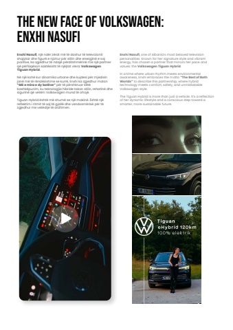 The New Face Of Volkswagen:Enxhi NasufiEnxhi Nasufi, nj%u00eb nd%u00ebr z%u00ebrat m%u00eb t%u00eb dashur t%u00eb televizionit shqiptar dhe figur%u00eb e njohur p%u00ebr stilin dhe energjin%u00eb e saj pozitive, ka zgjedhur t%u00eb ndaj%u00eb p%u00ebrditshm%u00ebrin%u00eb me nj%u00eb partner q%u00eb p%u00ebrfaq%u00ebson sakt%u00ebsisht t%u00eb nj%u00ebjtat vlera: Volkswagen Tiguan Hybrid.N%u00eb nj%u00eb koh%u00eb kur dinamika urbane dhe kujdesi p%u00ebr mjedisin jan%u00eb m%u00eb t%u00eb r%u00ebnd%u00ebsishme se kurr%u00eb, Enxhi ka zgjedhur moton %u201cM%u00eb e mira e dy bot%u00ebve%u201d p%u00ebr t%u00eb p%u00ebrshkruar k%u00ebt%u00eb bashk%u00ebpunim, ku teknologjia hibride takon stilin, rehatin%u00eb dhe sigurin%u00eb q%u00eb vet%u00ebm Volkswagen mund t%u00eb ofroj%u00eb.Tiguan Hybrid %u00ebsht%u00eb m%u00eb shum%u00eb se nj%u00eb makin%u00eb. %u00cbsht%u00eb nj%u00eb reflektim i ritmit t%u00eb saj t%u00eb gjall%u00eb dhe vendosm%u00ebris%u00eb p%u00ebr t%u00eb zgjedhur me vet%u00ebdije t%u00eb ardhmen.Enxhi Nasufi, one of Albania%u2019s most beloved television personalities known for her signature style and vibrant energy, has chosen a partner that mirrors her pace and values: the Volkswagen Tiguan Hybrid.In a time where urban rhythm meets environmental awareness, Enxhi embraces the motto %u201cThe Best of Both Worlds%u201d to describe this partnership, where hybrid technology meets comfort, safety, and unmistakable Volkswagen style.The Tiguan Hybrid is more than just a vehicle. It%u2019s a reflection of her dynamic lifestyle and a conscious step toward a smarter, more sustainable future.