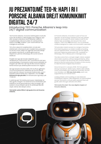 Tek Porsche Albania, inovacioni %u00ebsht%u00eb pjes%u00eb e kultur%u00ebs son%u00eb. Me zhvillimin e teknologjis%u00eb, kemi d%u00ebgjuar nga af%u00ebr nevojat e klient%u00ebve tan%u00eb: efikasitet, akses t%u00eb menj%u00ebhersh%u00ebm dhe komunikim t%u00eb vazhduesh%u00ebm. K%u00ebshtu lindi TEO, chatbot-i yn%u00eb i automatizuar me inteligjenc%u00eb artificiale.TEO ofron akses t%u00eb menj%u00ebhersh%u00ebm n%u00eb nj%u00eb s%u00ebr%u00eb sh%u00ebrbimesh: informacion p%u00ebr modelet tona, prenotim t%u00eb servisit online, lidhje me agjent%u00ebt tan%u00eb dhe detaje p%u00ebr pjes%u00ebt e k%u00ebmbimit. Ai %u00ebsht%u00eb gjithmon%u00eb n%u00eb dispozicion p%u00ebrmes WhatsApp, n%u00eb numrin ton%u00eb t%u00eb dedikuar.Projekti nisi nga nj%u00eb nevoj%u00eb e thjesht%u00eb, por e r%u00ebnd%u00ebsishme: informacion 24/7, pa kufizime orari apo vendndodhjeje. Si kompania e par%u00eb automobilistike n%u00eb Shqip%u00ebri q%u00eb nd%u00ebrmerr nj%u00eb hap t%u00eb till%u00eb, Porsche Albania %u00ebsht%u00eb krenare q%u00eb udh%u00ebheq k%u00ebt%u00eb transformim digjital.Q%u00eb nga lan%u00e7imi n%u00eb janar 2025, TEO ka fituar gjithnj%u00eb e m%u00eb shum%u00eb p%u00ebrdorues. Nd%u00ebrkoh%u00eb q%u00eb shum%u00eb klient%u00eb kan%u00eb qen%u00eb t%u00eb m%u00ebsuar me kanale tradicionale, numri i bisedave ditore %u00ebsht%u00eb rritur ndjesh%u00ebm, me mbi 100 k%u00ebrkesa t%u00eb reja %u00e7do dit%u00eb, t%u00eb menaxhuara nga ekipi yn%u00eb i trajnuar.E ardhmja p%u00ebr TEO %u00ebsht%u00eb premtuese: mb%u00ebshtetje n%u00eb disa gjuh%u00eb, integrim me sistemet tona t%u00eb klient%u00ebve p%u00ebr sh%u00ebrbime m%u00eb t%u00eb personalizuara, dhe s%u00eb shpejti nj%u00eb asistent virtual shitjesh q%u00eb do t%u00eb udh%u00ebheq%u00eb klient%u00ebt n%u00ebp%u00ebr ofertat dhe blerjet online.TEO %u00ebsht%u00eb vet%u00ebm fillimi i nj%u00eb epoke t%u00eb re n%u00eb Porsche Albania.At Porsche Albania, innovation is part of how we operate. As technology transforms the way people interact, we focused on what matters most to our clients: fast, accessible, and around-the-clock support. That%u2019s how TEO was born, our AI-powered chatbot designed to make communication seamless.TEO provides instant access to a range of services, from learning about our latest models to booking service appointments, connecting with live agents, and even exploring spare parts info. Available on WhatsApp, TEO is always just a message away.The idea came from a simple insight: clients needed information anytime, without being limited by office hours or location. By launching TEO, Porsche Albania became the first automotive company in the country to take this kind of digital step forward.Since its launch in January 2025, TEO has gained strong momentum. While many clients were initially more comfortable with traditional channels, the bot now handles over 100 new chats daily, each one supported by our trained team.Looking ahead, we%u2019re working on new features: multilingual support, CRM integration for personalized service, and even a virtual sales assistant that will guide users through vehicles and offers. TEO marks the start the new digital chapter of Porsche Albania.Ju prezantojm%u00eb TEO-n: Hapi i ri iPorsche Albania drejt komunikimitdigjital 24/7Introducing TEO: Porsche Albania%u2019s leap into24/7 digital communication