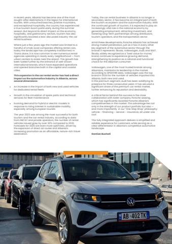 In recent years, Albania has become one of the most sought-after destinations in the region for international tourists. With untouched beaches, pristine mountains, and exceptional hospitality, the country has experienced a true tourism boom particularly during the summer season. But beyond its direct impact on the economy, hospitality, and gastronomy sectors, tourism has also significantly boosted a less-discussed industry: the car rental business.Where just a few years ago the market was limited to a handful of small, local companies offering rental cars, today the landscape has completely transformed. In Tirana alone, it is now common to see numerous rental agencies operating in nearly every neighborhood %u2014 from urban centers to areas near the airport. This growth has been fueled further by the entrance of well-known international brands, which have expanded operations and opened branches both in the capital and coastal cities.This expansion in the car rental sector has had a direct impact on the automotive industry in Albania, across several dimensions:An increase in the import of both new and used vehicles for dedicated rental fleetsGrowth in the circulation of spare parts and technical services for fleet maintenanceEvolving demand for hybrid or electric models in response to rising interest in sustainable mobility, especially among European touristsThe year 2023 was among the most successful for both tourism and the car rental industry. According to data from INSTAT and private operators, the number of rental vehicles issued grew by over 30% compared to 2022. Forecasts for 2025 are even more optimistic, driven by the expansion of direct air routes and Albania%u2019s increasing promotion as an affordable, nature-rich travel destination.Today, the car rental business in Albania is no longer a secondary sector, it has become an integral part of both the tourism ecosystem and the automotive industry. With the continued growth of tourism, it is expected to play an increasingly vital role in the national economy by generating employment, attracting investment, and fostering long-term partnerships among distributors, tourism operators, and the transportation sector.Amid these developments, Porsche Albania has achieved strong market penetration, just as it has in every other key segment of the automotive sector through the brands it represents: %u0160koda, Volkswagen, Audi, and SEAT.%u0160koda, widely recognized as a \brand, continues to experience growing demand, strengthening its position as a rational and functional choice for the Albanian consumer.Volkswagen, one of the most trusted brands among Albanians, maintains its leadership in the market. According to DPDHTRR data, Volkswagen was the top brand in 2024 for the number of vehicles imported into Albania, both new and used.In the premium segment, Audi has been solidifying its presence for three consecutive years. It has secured a significant share of the premium car rental market, further enhancing its reputation and desirability.A critical factor behind this success is the close collaboration with sister company Porsche Leasing, which has significantly boosted Porsche Albania%u2019s competitiveness in the market. This advantage lies not only in the strength of our product portfolio but also %u2014 and more importantly in our \vehicle %u2013 financing %u2013 service %u2013 insurance, all under one roof.This fully integrated approach delivers a simplified and reliable experience for customers, while serving as a clear differentiator in Albania%u2019s competitive automotive landscape.Gentian Bushati