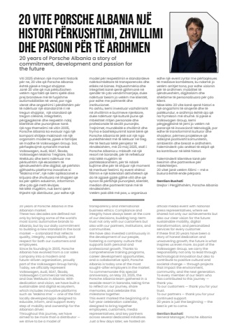 Viti 2025 sh%u00ebnon nj%u00eb moment historik p%u00ebr ne, 20 vite q%u00eb Porsche Albania %u00ebsht%u00eb pjes%u00eb e tregut shqiptar. Jan%u00eb 20 vite q%u00eb nuk p%u00ebrkufizohen vet%u00ebm nga fakti q%u00eb kemi sjell%u00eb disa prej brandeve m%u00eb t%u00eb fuqishme automobilistike n%u00eb vend, por nga vlerat dhe angazhimi i p%u00ebrditsh%u00ebm p%u00ebr t%u00eb nd%u00ebrtuar nj%u00eb standard t%u00eb ri n%u00eb tregun shqiptar, nj%u00eb standard q%u00eb tregon cil%u00ebsin%u00eb, integritetin, p%u00ebrgjegj%u00ebsin%u00eb dhe respektin ndaj klient%u00ebve dhe punonj%u00ebsve tan%u00eb.Q%u00eb nga themelimi n%u00eb vitin 2005, Porsche Albania ka evoluar nga nj%u00eb kompani shitjeje makinash n%u00eb nj%u00eb organizim moderne, pjes%u00eb e familjes s%u00eb madhe t%u00eb Volkswagen Group. Sot, p%u00ebrfaq%u00ebsojm%u00eb zyrtarisht markat Volkswagen, Audi, SEAT, %u0160koda, Volkswagen Makina Tregtare, Das WeltAuto dhe kemi nd%u00ebrtuar me p%u00ebrkushtim nj%u00eb ekosistem t%u00eb q%u00ebndruesh%u00ebm dhe digjital, q%u00eb p%u00ebrfshin gjithashtu platforma inovative si %u201cMakina Ime%u201d, nj%u00eb nd%u00ebr aplikacionet e krijuara dhe zhvilluara n%u00eb Shqip%u00ebri q%u00eb ka p%u00ebr q%u00ebllim edukimin, informimin dhe %u00e7do gj%u00eb rreth l%u00ebvizjes. N%u00eb k%u00ebt%u00eb rrug%u00ebtim, nuk kemi qen%u00eb thjesht nj%u00eb distributor, por edhe nj%u00eb model p%u00ebr respektimin e standardeve nd%u00ebrkomb%u00ebtare t%u00eb transparenc%u00ebs dhe etik%u00ebs n%u00eb biznes. Pajtueshm%u00ebria dhe integriteti kan%u00eb qen%u00eb gjithmon%u00eb n%u00eb qend%u00ebr t%u00eb %u00e7do vendimmarrjeje, duke nd%u00ebrtuar besim jo vet%u00ebm me klient%u00ebt, por edhe me partner%u00ebt dhe institucionet.Po ashtu, kemi investuar vazhdimisht n%u00eb zhvillimin e burimeve njer%u00ebzore, duke nd%u00ebrtuar nj%u00eb kultur%u00eb pune q%u00eb mb%u00ebshtet rritjen personale dhe profesionale t%u00eb secilit punonj%u00ebs. Trajnimet, mund%u00ebsit%u00eb e zhvillimit dhe fryma e bashk%u00ebpunimit kan%u00eb b%u00ebr%u00eb q%u00eb Porsche Albania t%u00eb jet%u00eb sot nj%u00eb nga pun%u00ebdh%u00ebn%u00ebsit m%u00eb t%u00eb k%u00ebrkuar n%u00eb treg.P%u00ebr t%u00eb festuar k%u00ebt%u00eb p%u00ebrvjetor t%u00eb r%u00ebnd%u00ebsish%u00ebm, m%u00eb 23 maj 2025, stafi i Porsche Albania u mblodh n%u00eb nj%u00eb resort n%u00eb Sarand%u00eb, p%u00ebr t%u00eb reflektuar mbi k%u00ebt%u00eb rrug%u00ebtim t%u00eb jasht%u00ebzakonsh%u00ebm, p%u00ebr t%u00eb ndar%u00eb kujtime dhe p%u00ebr t%u00eb shijuar nj%u00eb moment t%u00eb merituar festimi. Ky event sh%u00ebnoi fillimin e nj%u00eb kalendari aktivitetesh q%u00eb do t%u00eb zgjas%u00eb gjat%u00eb gjith%u00eb vitit dhe q%u00eb synon t%u00eb p%u00ebrfshij%u00eb punonj%u00ebsit, klient%u00ebt, median dhe partner%u00ebt tan%u00eb m%u00eb t%u00eb r%u00ebnd%u00ebsish%u00ebm.Vet%u00ebm pak dit%u00eb m%u00eb pas, u organizua edhe nj%u00eb event zyrtar me p%u00ebrfaq%u00ebsues t%u00eb mediave komb%u00ebtare, ku ndam%u00eb jo vet%u00ebm arritjet tona, por edhe vizionin p%u00ebr t%u00eb ardhmen: mobilitet t%u00eb q%u00ebndruesh%u00ebm, digjitalizim dhe sh%u00ebrbime t%u00eb personalizuara p%u00ebr %u00e7do klient.N%u00ebse k%u00ebto 20 vite kan%u00eb qen%u00eb histori e nj%u00eb angazhimi t%u00eb sinqert%u00eb dhe t%u00eb pal%u00ebkundur, e ardhmja %u00ebsht%u00eb ajo q%u00eb na frym%u00ebzon m%u00eb shum%u00eb. Si pjes%u00eb e Volkswagen Group, kemi p%u00ebrgjegj%u00ebsin%u00eb t%u00eb jemi jo vet%u00ebm n%u00eb pararoj%u00eb t%u00eb inovacionit teknologjik, por edhe t%u00eb transformimit kulturor dhe shoq%u00ebror, p%u00ebrmes projekteve q%u00eb ndikojn%u00eb pozitivisht komunitetin, ambientin dhe brezat e ardhsh%u00ebm.Faleminderit %u00e7do an%u00ebtari t%u00eb ekipit q%u00eb ka kontribuar n%u00eb k%u00ebt%u00eb histori.Faleminderit klient%u00ebve tan%u00eb p%u00ebr besimin dhe partner%u00ebve p%u00ebr mb%u00ebshtetjen. 20 vitet jan%u00eb vet%u00ebm fillimi %u2013 m%u00eb e bukura %u00ebsht%u00eb ende p%u00ebrpara.Gentian BushatiDrejtor i P%u00ebrgjithsh%u00ebm, Porsche Albania20 years of Porsche Albania in the Albanian market.These two decades are defined not only by bringing some of the world%u2019s most iconic automotive brands to Albania, but by our daily commitment to building a new standard in the local market %u2014 a standard that reflects quality, integrity, responsibility, and respect for both our customers and employees.Since its founding in 2005, Porsche Albania has evolved from a car sales company into a modern and future-driven organization, proudly part of the Volkswagen Group family. Today, we officially represent Volkswagen, Audi, SEAT, %u0160koda, Volkswagen Commercial Vehicles, and Das WeltAuto in Albania. With dedication and vision, we have built a sustainable and digital ecosystem, which includes innovative platforms such as \locally developed apps designed to educate, inform, and support every step of mobility and ownership for the Albanian driver.Throughout this journey, we have aimed to be more than a distributor %u2014 we strive to be a model of transparency and international business ethics. Compliance and integrity have always been at the core of our decisions, building long-term trust not only with our customers but also with our partners, institutions, and communities.We have also invested continuously in the development of our people, fostering a company culture that supports both personal and professional growth. Thanks to comprehensive training programs, career development opportunities, and a collaborative spirit, Porsche Albania is today one of the most sought-after employers in the market.To commemorate this special anniversary, on May 23, 2025, the Porsche Albania team gathered in a seaside resort in Saranda, taking time to reflect on our journey, share memories, and celebrate this milestone together.This event marked the beginning of a full-year celebration calendar, designed to bring together employees, c