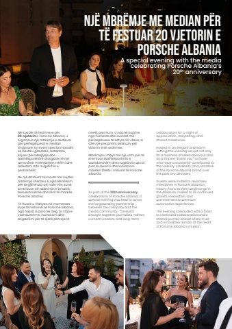 Nj%u00eb mbr%u00ebmje me median p%u00ebrt%u00eb festuar 20 vjetorin ePorsche AlbaniaA special evening with the mediacelebrating Porsche Albania%u2019s20th anniversaryN%u00eb kuad%u00ebr t%u00eb festimeve p%u00ebr 20-vjetorin e Porsche Albania, u organizua nj%u00eb mbr%u00ebmje e dedikuar p%u00ebr p%u00ebrfaq%u00ebsuesit e medias shqiptare. Ky event special mblodhi s%u00eb bashku gazetar%u00eb, redaktor%u00eb, krijues p%u00ebrmbajtjeje dhe bashk%u00ebpun%u00ebtor%u00eb afatgjat%u00eb n%u00eb nj%u00eb atmosfer%u00eb mir%u00ebnjohjeje, rr%u00ebfimi dhe reflektimi mbi rrug%u00ebtimin e p%u00ebrbashk%u00ebt.N%u00eb nj%u00eb ambient t%u00eb kuruar me kujdes, mbr%u00ebmja sh%u00ebrbeu si nj%u00eb fal%u00ebnderim p%u00ebr t%u00eb gjith%u00eb ata q%u00eb, nd%u00ebr vite, kan%u00eb kontribuar n%u00eb nd%u00ebrtimin e imazhit, besueshm%u00ebris%u00eb dhe z%u00ebrit t%u00eb mark%u00ebs Porsche Albania.T%u00eb ftuarit u rikthyen n%u00eb momentet ky%u00e7e t%u00eb historis%u00eb s%u00eb Porsche Albania, nga hapat e para n%u00eb treg, te rritja e vazhdueshme, inovacioni dhe angazhimi p%u00ebr t%u00eb sjell%u00eb p%u00ebrvoja t%u00eb nivelit premium. U ndan%u00eb kujtime nga fushatat dhe eventet m%u00eb p%u00ebrfaq%u00ebsuese t%u00eb k%u00ebtyre 20 viteve, si dhe nj%u00eb prezantim ekskluziv p%u00ebr vizionin e s%u00eb ardhmes.Mbr%u00ebmja u mbyll me nj%u00eb urim p%u00ebr t%u00eb kremtuar bashk%u00ebpunimin e vazhduesh%u00ebm dhe rrug%u00ebtimin q%u00eb na pret ku besimi dhe inovacioni mbeten thelbi i misionit t%u00eb Porsche Albania.As part of the 20th anniversary celebrations of Porsche Albania, a special evening was held to honor the longstanding partnership between the company and the media community. The event brought together journalists, editors, content creators, and long-term collaborators for a night of appreciation, storytelling, and shared milestones.Hosted in an elegant and warm setting, the evening served not only as a moment of celebration but also as a sincere %u201cthank you%u201d to those who have consistently contributed to the visibility, credibility, and narrative of the Porsche Albania brand over the past two decades.Guests were invited to revisit key milestones in Porsche Albania%u2019s history, from its early beginnings in the Albanian market to its continued growth, innovation, and commitment to premium automotive experiences. The evening concluded with a toast to continued collaboration and a shared journey ahead where trust, and innovation remain at the heart of Porsche Albania%u2019s mission